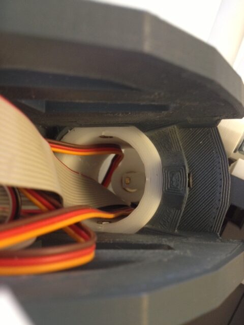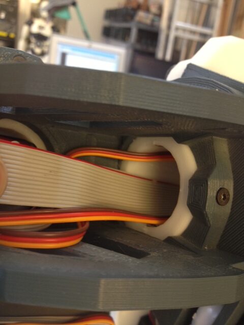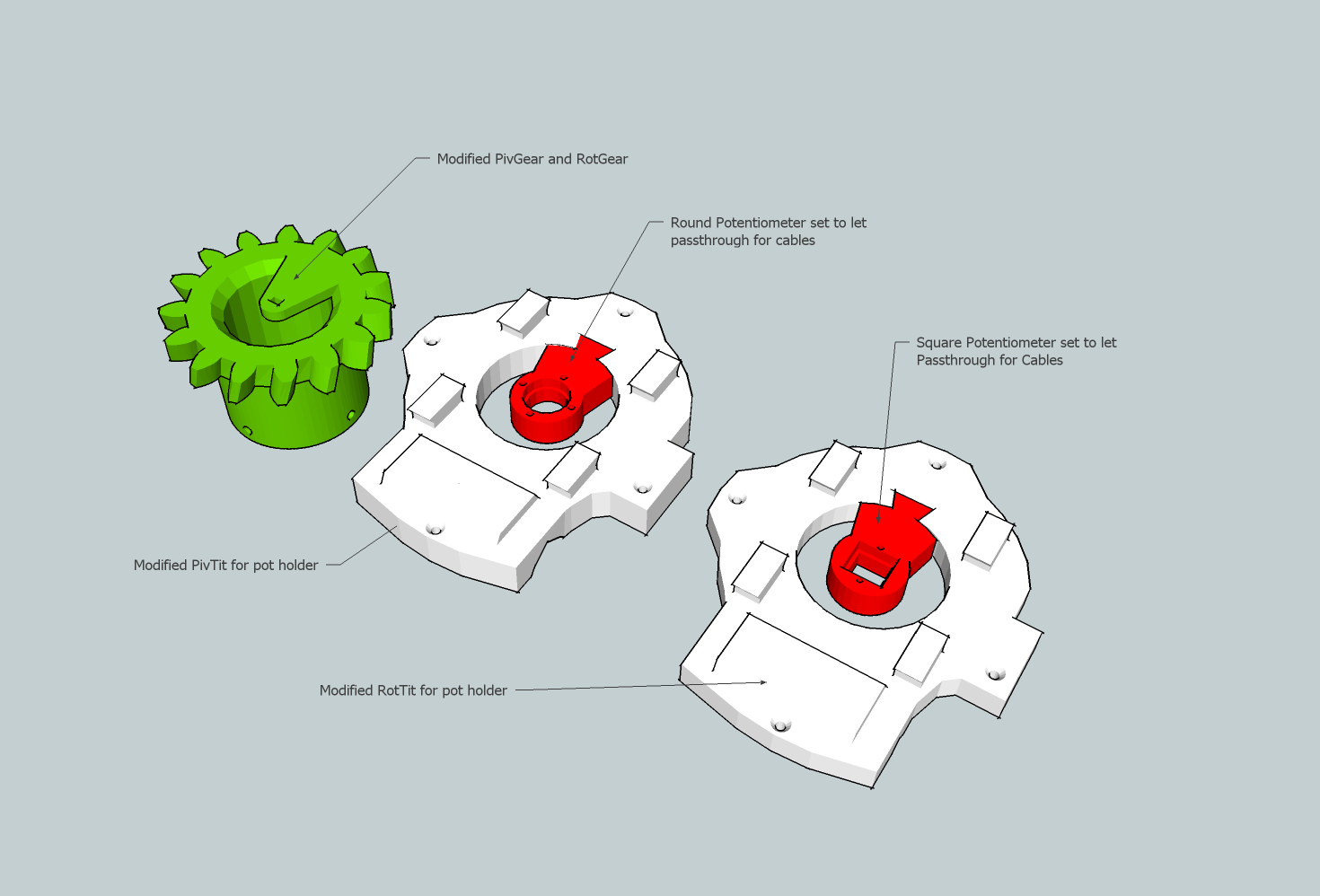 In the process, I modfied the pot holders in the shoulders and the rotate gears, this is to give a pass through access for the ribbon cables that run from the Nervo Board to the arm and hand servos.