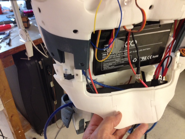 4. Bonjours a tous, je suis entrain de faire le torse et l’arrières et je vais attendre pour faire les bras, mains, la tête est terminée (pour les yeux j’ai mis que une camera mais pas les webcam conseiller, il faut que je rachètes des servos moteurs car je les ais alimenté avec du 12 volt, je crois que je les ais cramé).