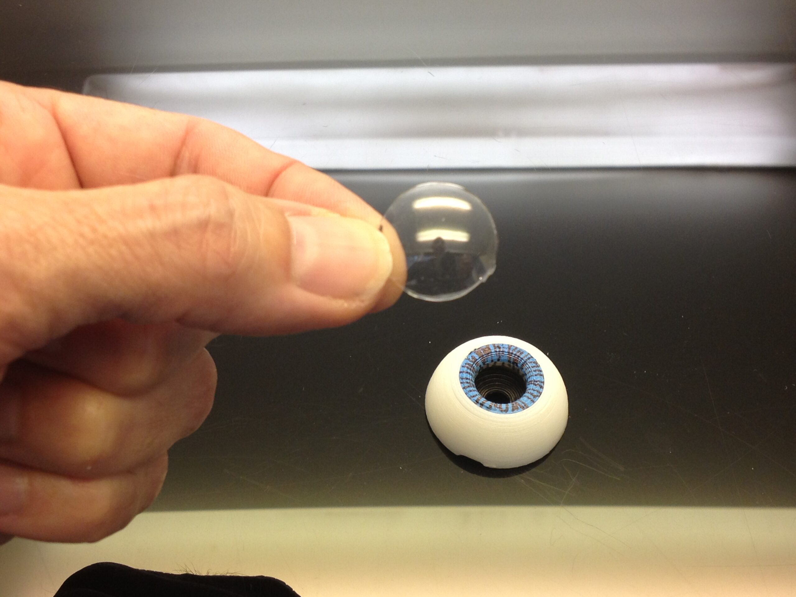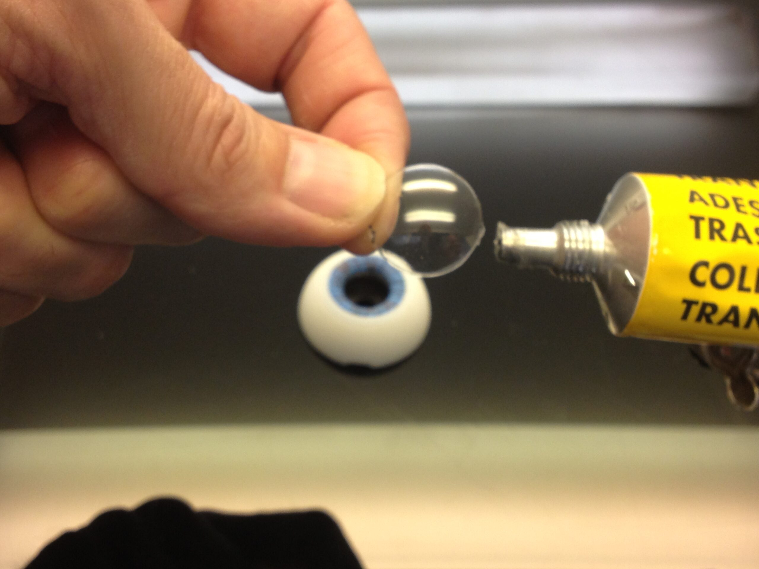 Glue the lentille on the pupile ring. Let it dry.