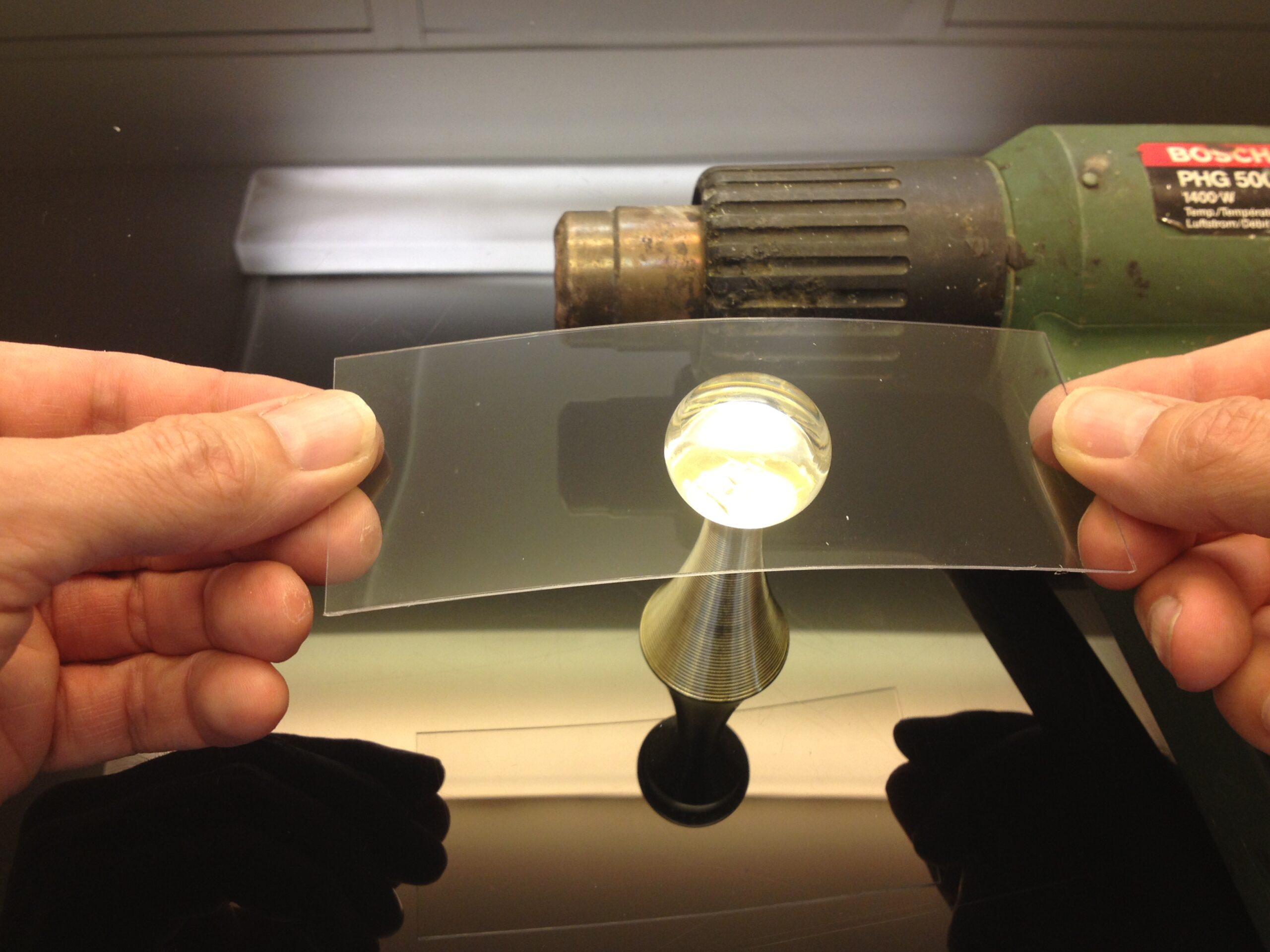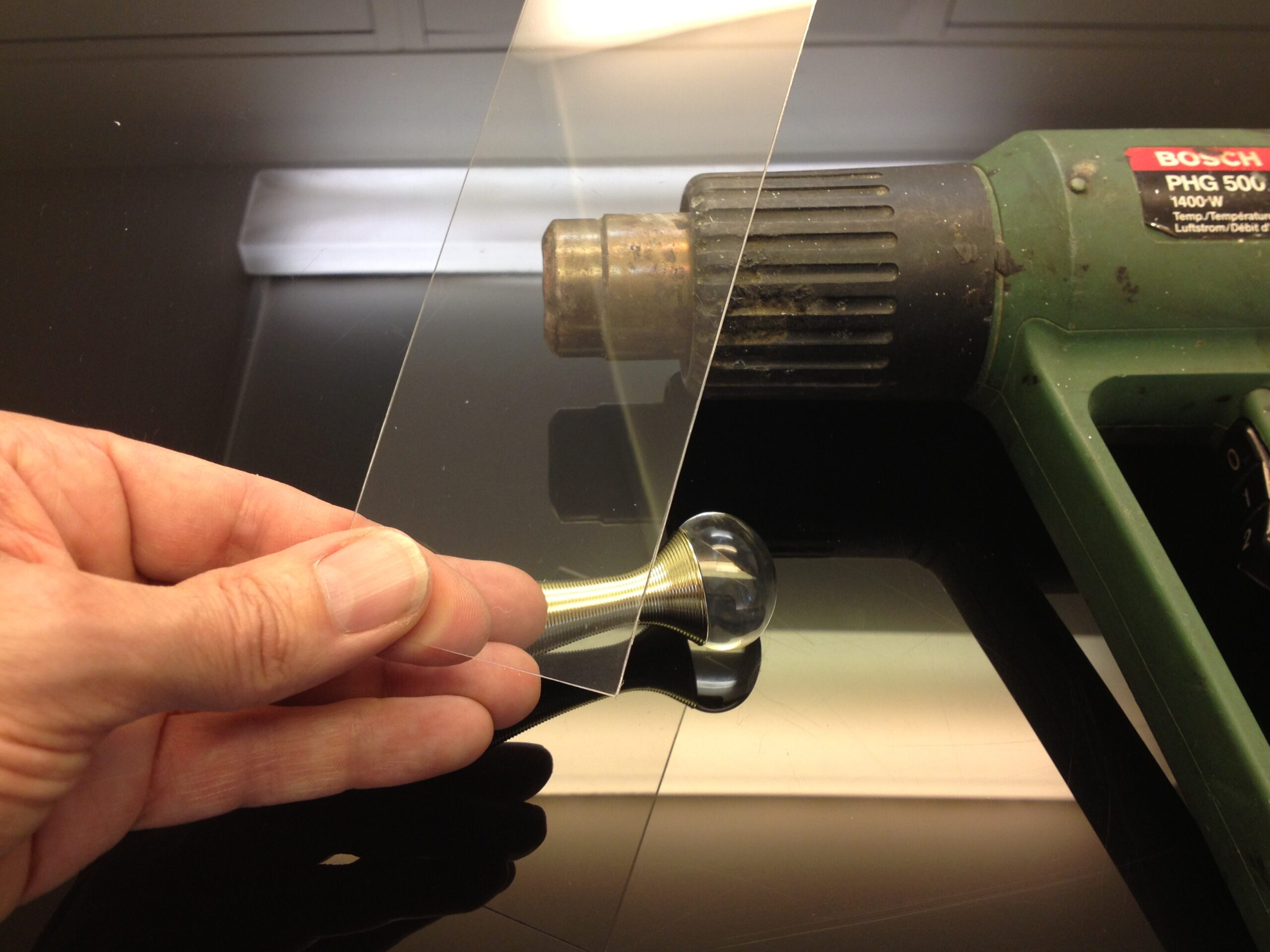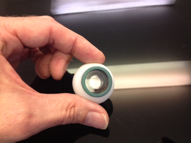 You will need a heat gun, a glass ball of approximately 3 cm diameter (I used the perfume cap « Dior, J’adore » of my wife, fancy eyes!! You also need a piece of thermoformable plastic (cristal clear is better, other wise it will alter the camera vision) I personnaly used a piece of a light bulb blister. But any cristal blister will do the job.