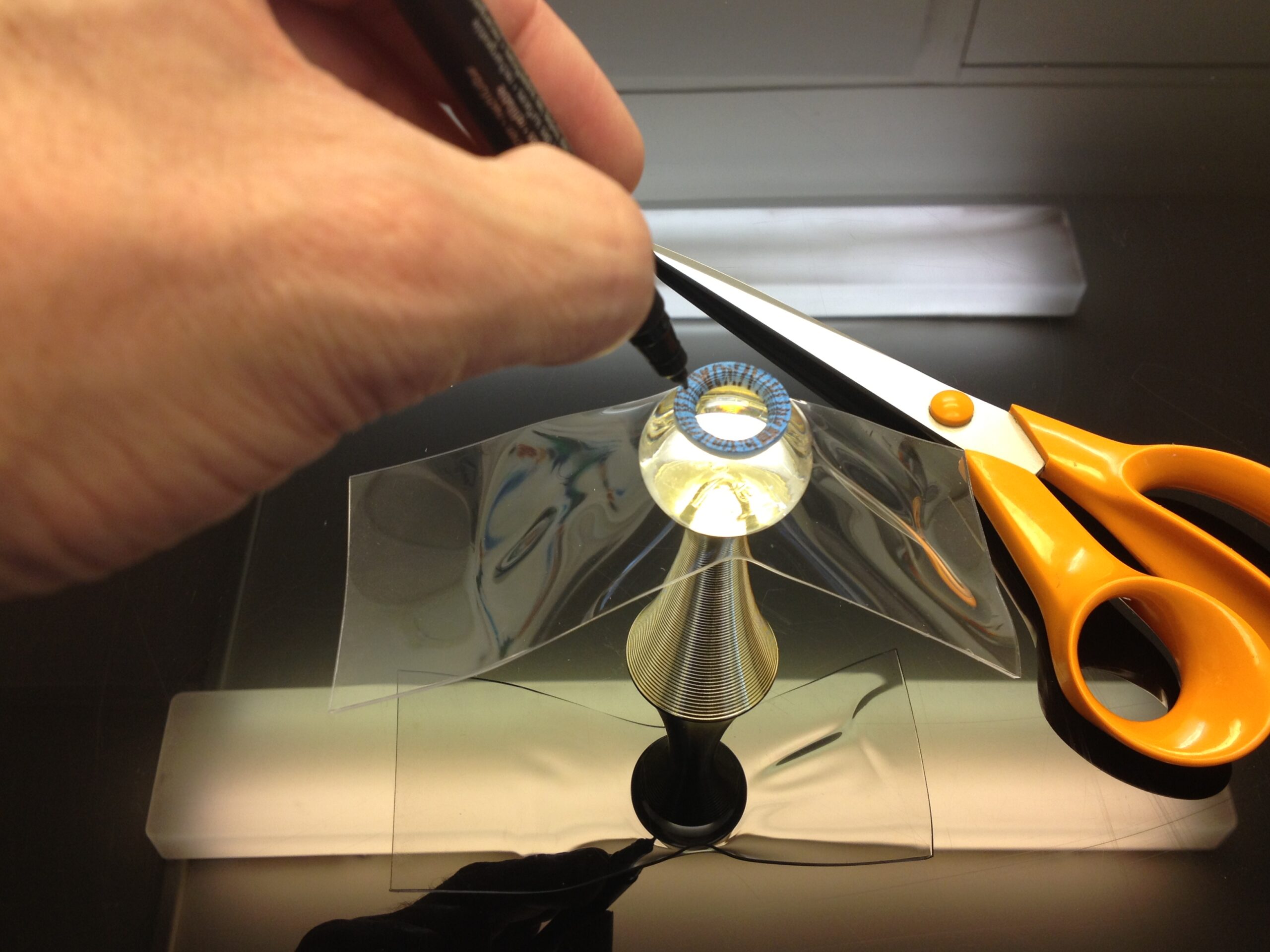 Mark the circle using the pupile ring, and cut out with scissors the lentille.