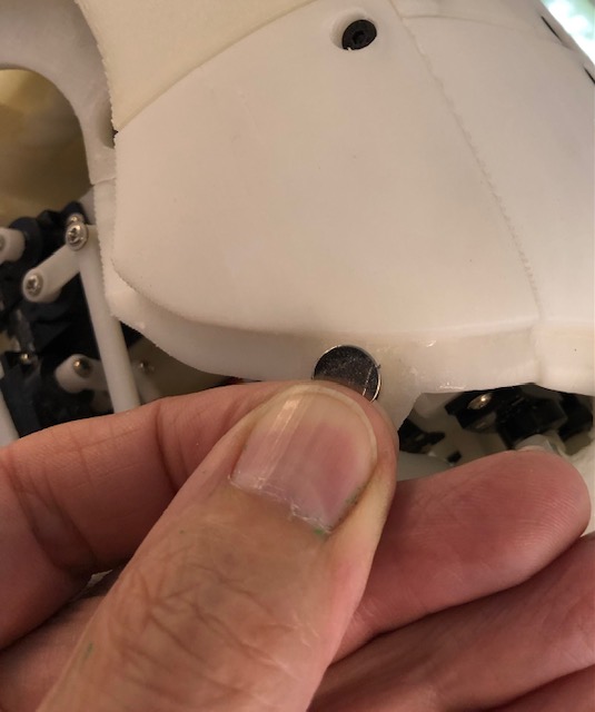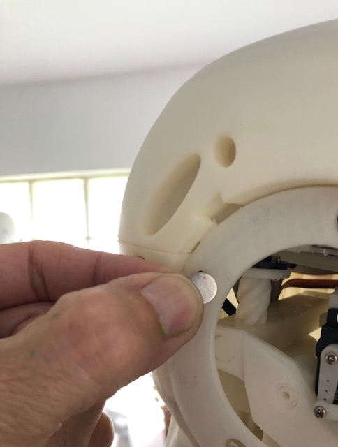 Glue the magnets with epoxy (two components glue) in the printed cavities of your printed head structure. Make sure to have the same polarity for all magnets in the printed parts.