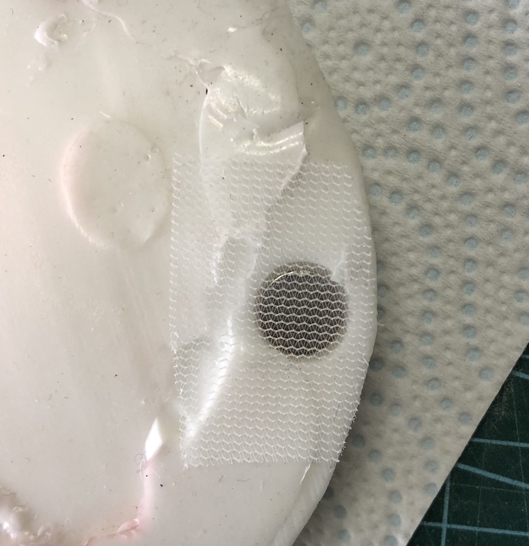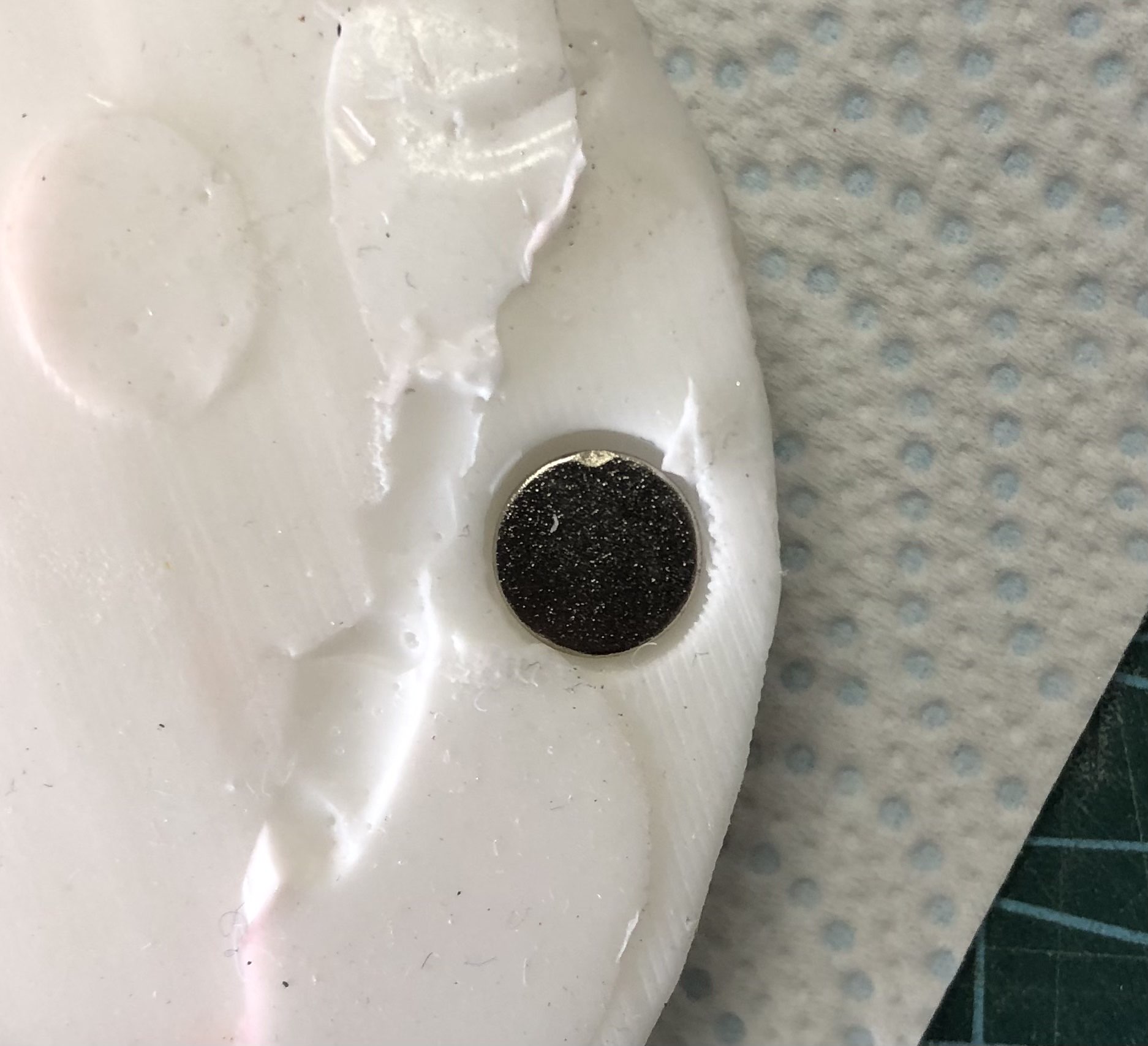 Then glue with a thin clothe and Silpoxy ( or Dow Corning 732) the other magnets in the cavities of the silicone skin. Make sure the polarity of the magnets set in the skin will match the polarity magnets in the printed parts.