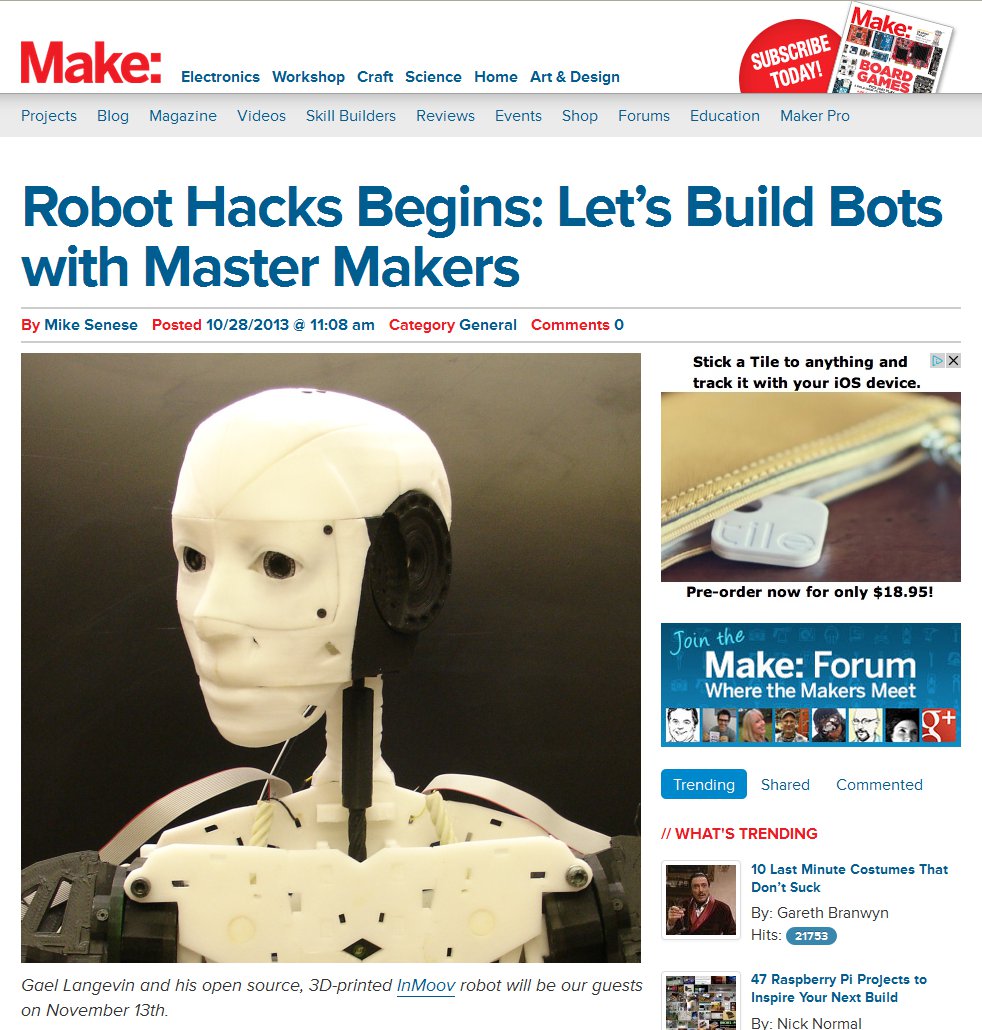 Make is organising a big robot hack and InMoov is involved. There should be a bunch of hangout sessions. This is going to be fun!! Chuck Fletcher, who presented his robot InMoov to the New York MakerFaire is going to be part of the sessions as well.