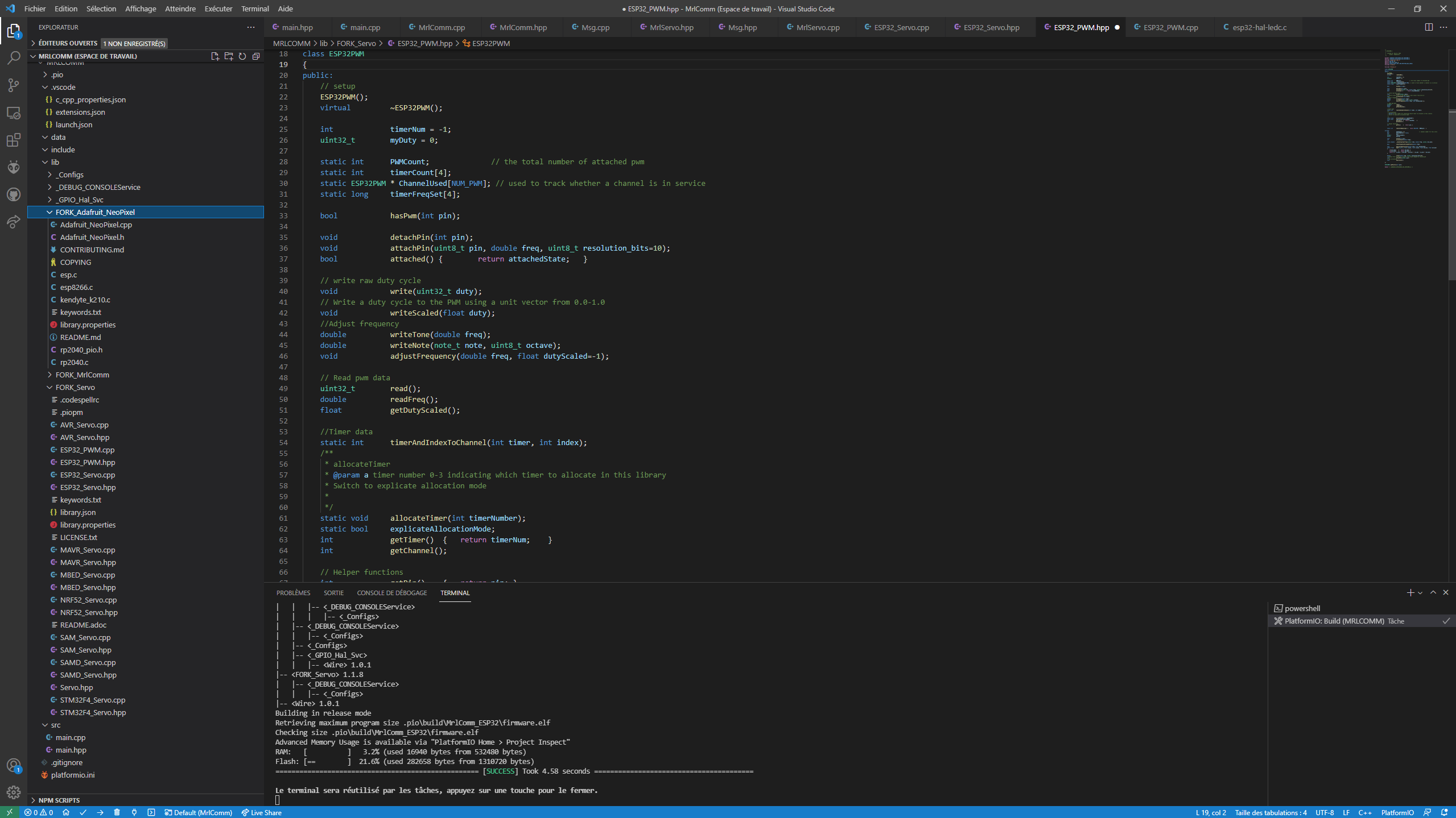 Cette version MrlCommESP32 comme je vais la nommer, n’est pas compilé sous l’IDE Arduino, mais sur VSCode , ce qui permet de travailler dans un environnement extremement puissant, et me permet de re-structurer sous forme de services et librairies MrlComm , et surtout d’avoir un confort de développement mixte arduino/c++ sous platformio pour compiler MrlComm aussi bien Arduino que espressif ou d’autre microcontrôleurs.