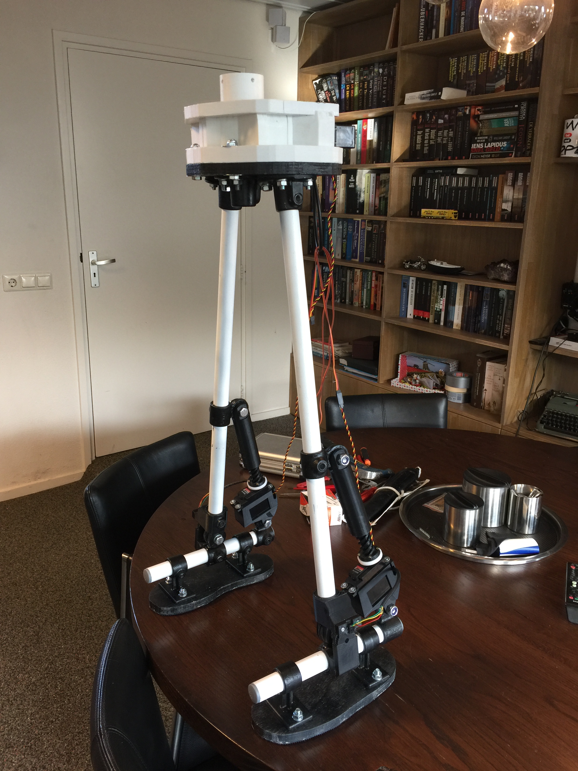 Only the ankles are moving forwards and backwards using two servos with pistons. (See picture 2). The actual position is controlled by using the potentiometers outside the servos. (see picture 3)