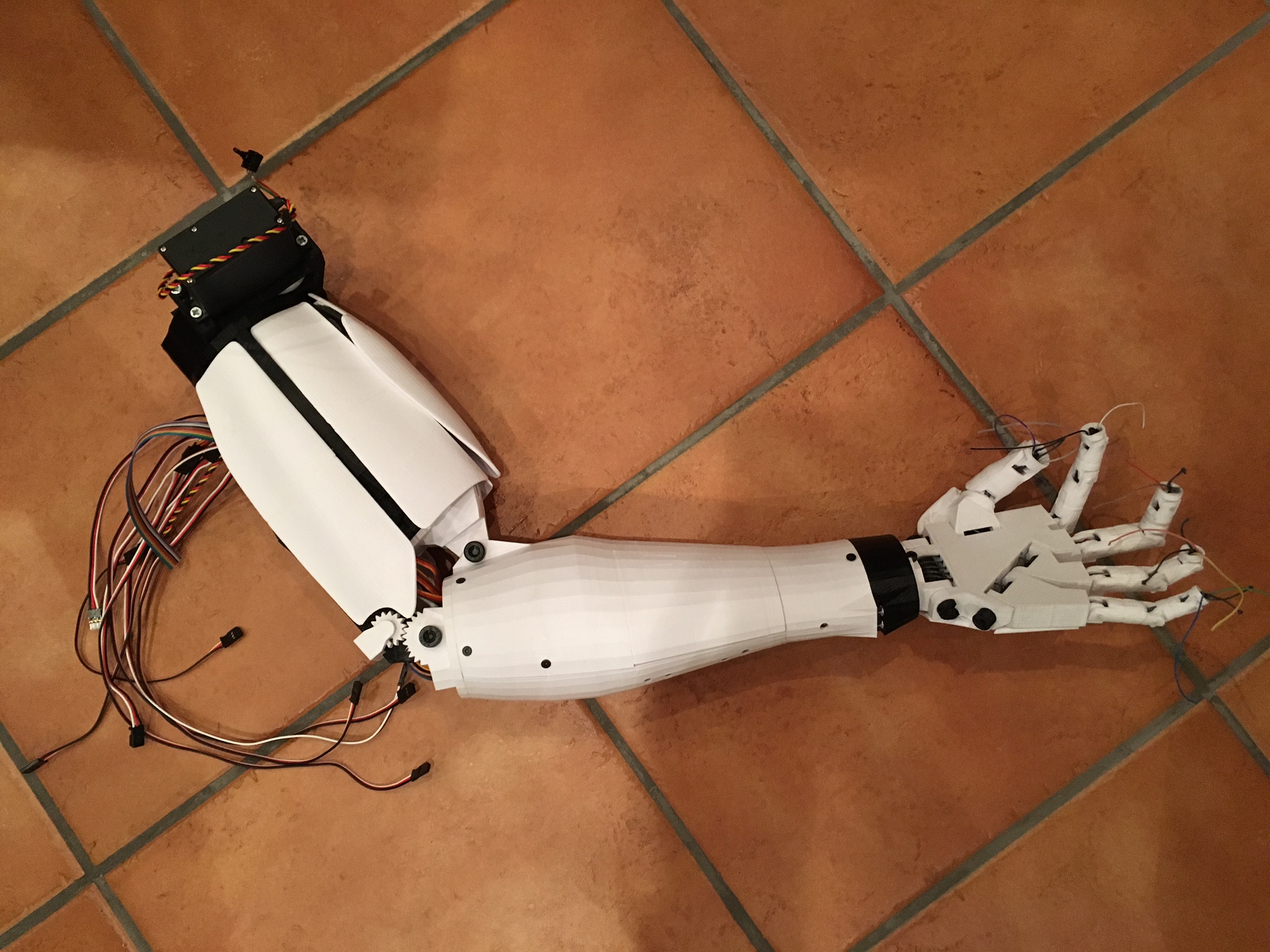 I had to wait forever for my Chinese fishing line to arrive, but once it arrived I got going again. Now the left arm, hand and bicep are finished, except for the fingertips. Everything works as it should with the Arduino.