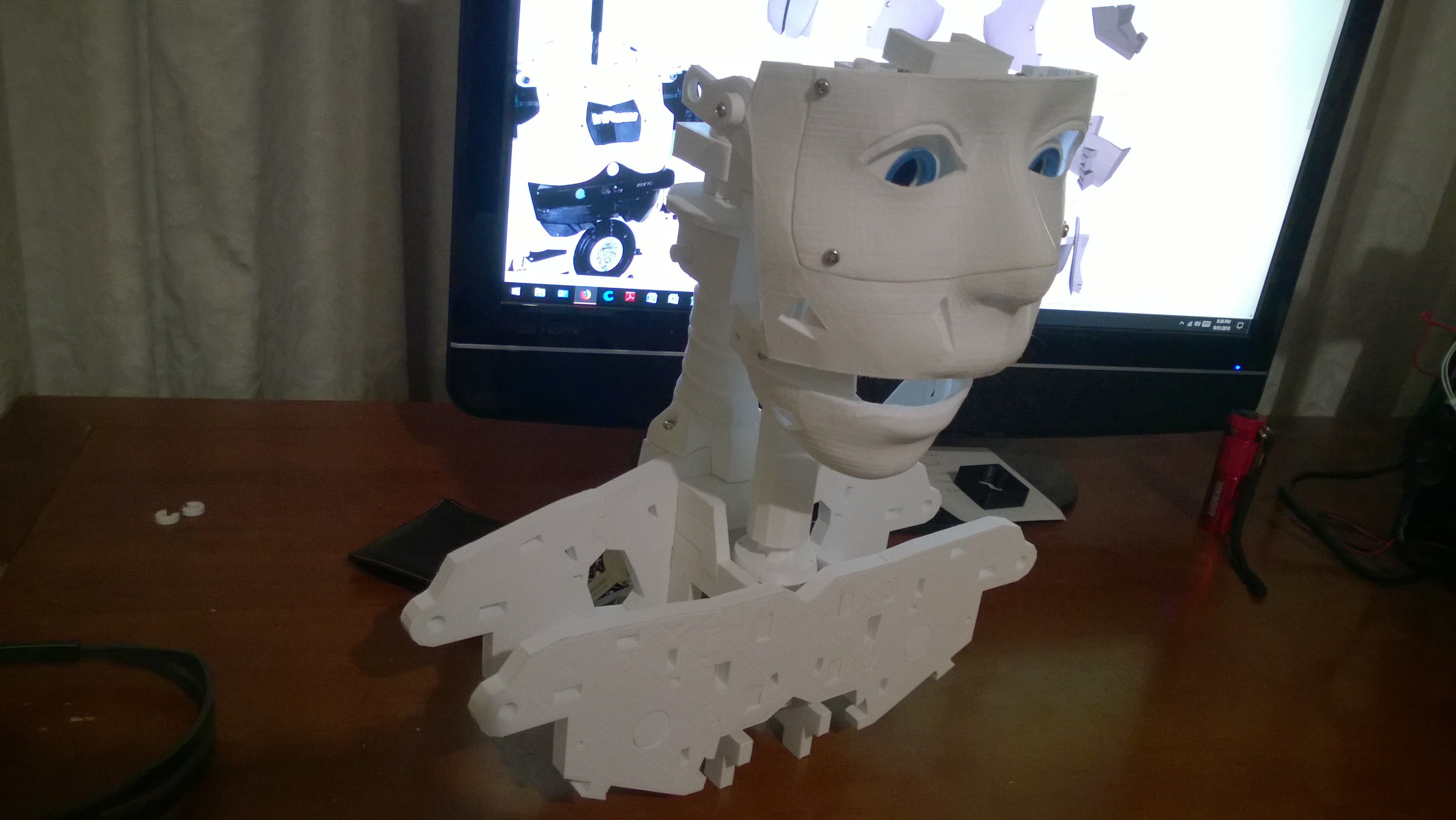 Hi. This is how far I have got my project. I have the head upright on the basic shoulder parts. I have my servos on order so I will be doing some work on wiring it up soon. The Shoulder area is not totally stable and I was wondering what extra parts add on the bottom to give it some stablity until I am ready to move on. Can any one direct me to the parts that add on next? Kind Regards Ian