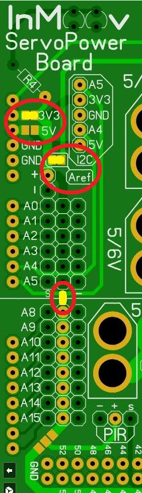 Add and solder the headers on the top of the Nervo board as shown on the picture. This will be to add the upper boards later. Also solder connect the powers if you plan to use the same voltage for all the servos.