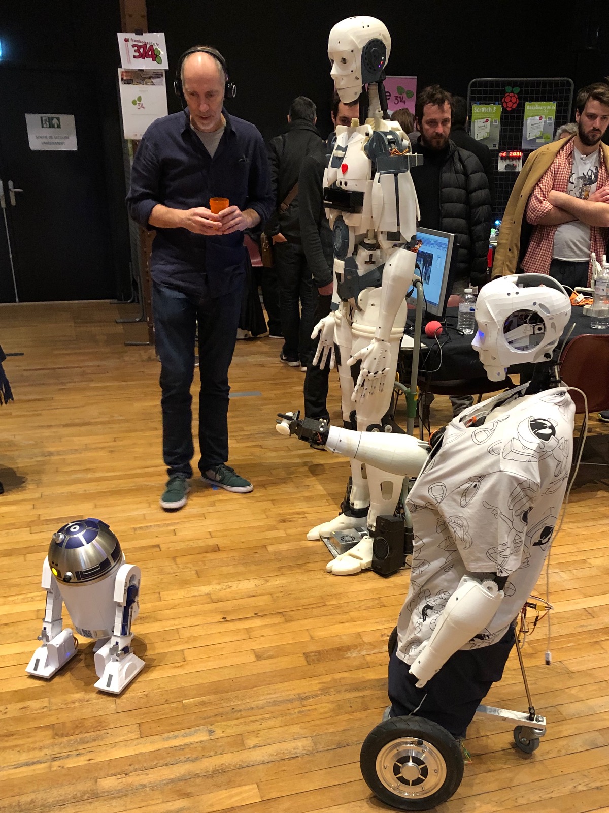InMoov on wheels and T-shirt, built by Jérôme holding a printed piece in it’s claws. Little R2-D2 built by Caliban association. A nice demonstration moment when all the robots interact with each other.